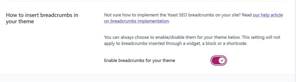 如果你同时也安装了 Yoast SEO 插件,它也带有面包屑导航功能,到 Settings -> Advanced -> Breadcrumbs 中打开最下面的