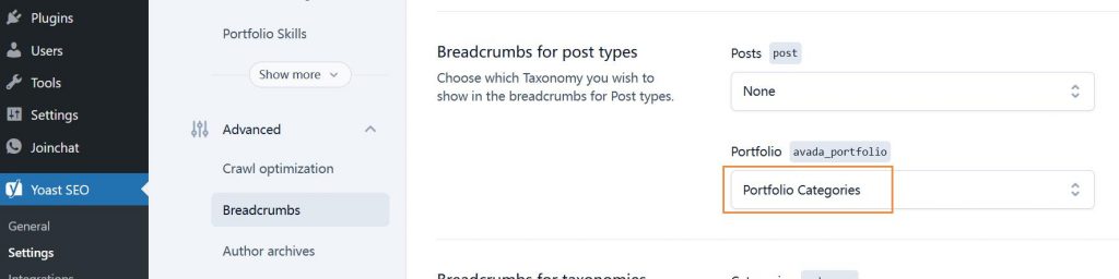 对于 Avada 和 Yoast 在 Settings -> Advanced -> Breadcrumbs -> Breadcrumbs for post types 中为 Portfolio (avada_portfolio)选择 Portfolio Categories