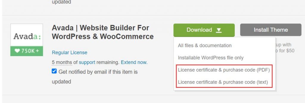找到 Avada,在其后的下拉箭头里下载 PDF 或者 Text 的 Purchase code。
