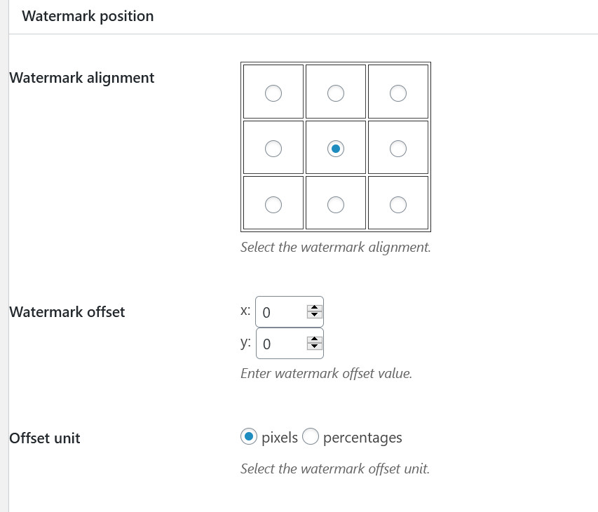 选择水印添加的位置,offset 是横纵轴的偏移量,Offset Unit 是偏移单位,按像素还是百分比偏移。